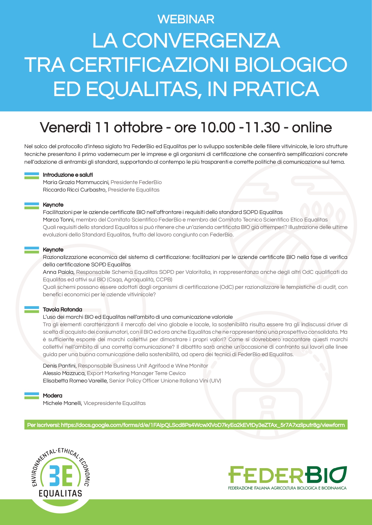 Venerdì 11 ottobre dalle 10 alle 11.30, si terrà un Webinar dal titolo “La convergenza tra certificazioni biologico ed Equalitas, in pratica” organizzato da FederBio e Equalitas.