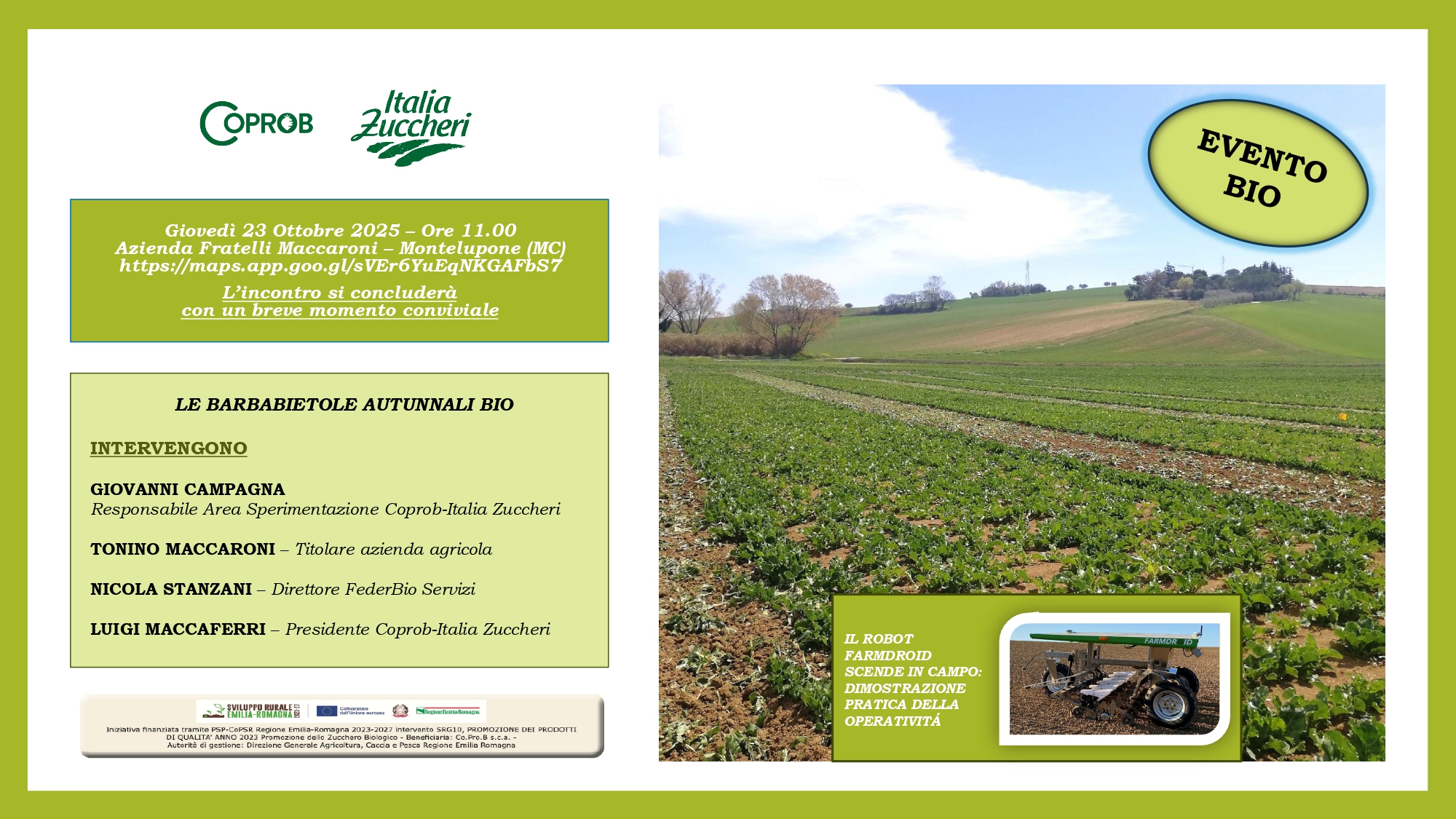 Giovedì 23 ottobre 2025 alle ore 11.00 presso l’azienda Agricola Fratelli Maccaroni si terrà una giornata in campo sulle barbabietole autunnali in biologico organizzata da Coprob e FederBio Servizi.